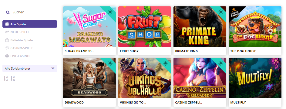 Bei Sugar Casino können Sie über 2.800 Spiele ausprobieren. Testen Sie alle Top-Anbieter wie NetEnt, Betsoft, Evolution, Pragmatic, Quickspin, Play'n GO, Elk Studios, Yggdrasil, Kalamba, ORYX, Gamomat, Thunderkick und viele mehr.